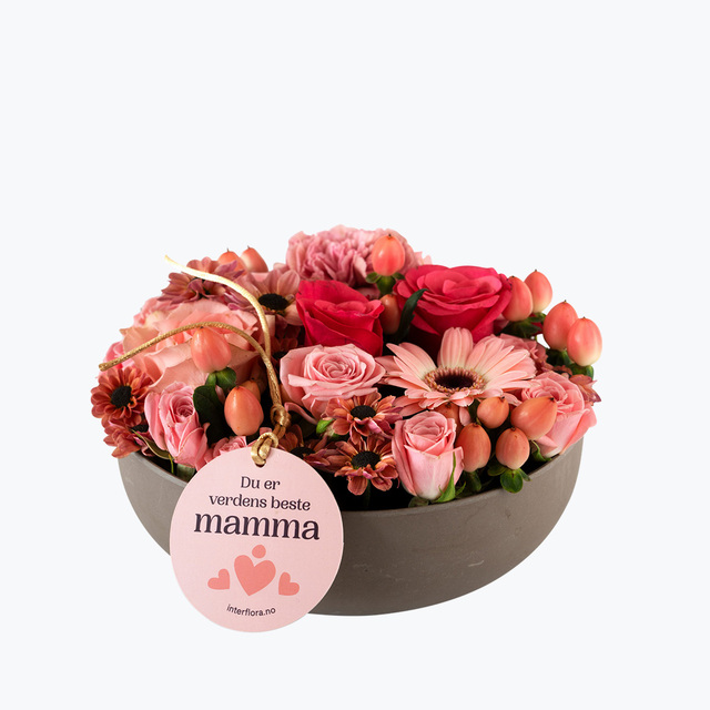 En søt dekorasjon i rosa toner med budskapet "du er verdens beste mamma!" Enkelt å motta fordi den kan settes rett på bordet. Vis mer